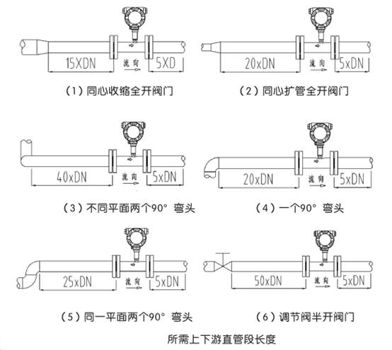 渦輪流量計對管道內流速分布畸變及旋轉流是敏感的,進入傳感器應為充分發展湍流,因此要根據傳感器上游側阻流件類型配備必要的直管段或整流器,要求入口段和出口段直管段長度。