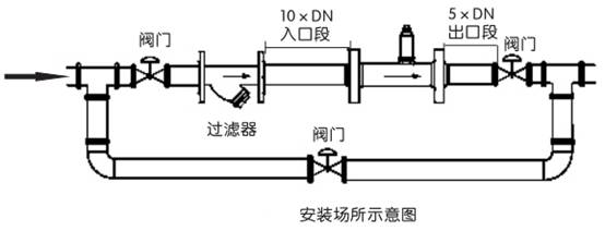 ●水平安裝傳感器要求管道不應有目測可察覺的傾斜(一般在5°以內),垂直安裝傳感器管道垂直度偏差亦應小于5°。在不能停流的場所,應裝旁通管和可靠的截止閥(見圖4-7),測量時要確保旁通管無泄漏。