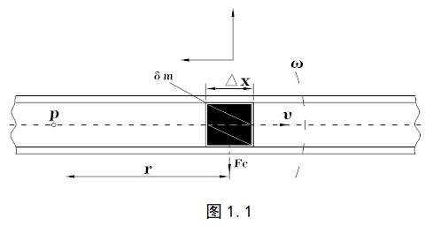 當一個位于以P為固定點(旋轉中心)作旋轉運動的管子內的質點做朝向旋轉中心或離向旋轉中心的運動時,將產生一慣性力,原理如圖1.1: 圖中質量為δm的質點以勻速υ在管道內向右運動,而管道圍繞固定點P以角速度ω旋轉。此時這個質點將獲得兩個加速度分量: