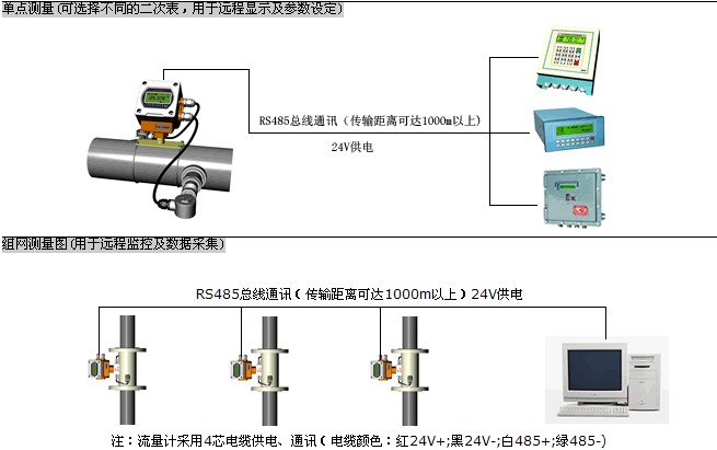 一次表與二次表(或計算機)之間采用RS-485總線通訊,采用普通電纜即可,傳輸距離可達1000米以上,組網(wǎng)十分方便、快捷。這種傳輸方式抗干擾能力佳,解決了分體式超聲波流量計專用電纜成本高、抗干擾能力差、傳輸距離短等問題。