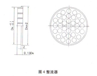 3、 整流器的安裝:場地限制,直管段無法滿足,應安裝整流器,見圖4,是一種非均勻分布多孔整流器,結構簡單,成本低,安裝方便,阻力損失小,安裝見圖5。