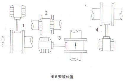 4、 安裝條件:渦街流量計應遠離振動源,有振動時在前后直管段2DN處加支架用橡皮減振。傳感器通徑圓應與直管段內徑圓保持同心。法蘭焊接時,密封夾緊時,管內不得有突出部分。流向應與箭頭方向一致。(高溫時推薦2、3、4位置,常溫和低溫時推薦1位置,垂直管道時選3位置)見圖6