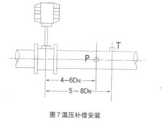 5、 溫度壓力補償安裝:P-壓力變送器,T-溫度傳感器,安裝在后直管段上,見圖7。