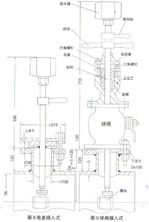 簡(jiǎn)易插入式渦街流量計(jì)結(jié)構(gòu)見圖8,球閥插入式渦街流量計(jì)結(jié)構(gòu)見圖9,當(dāng)松動(dòng)六角螺釘,轉(zhuǎn)動(dòng)把手將測(cè)頭提高到球閥以上時(shí),關(guān)閉球閥,實(shí)現(xiàn)不斷流檢修。 ![]() 插入式渦街流量計(jì)安裝特殊要求 1、 插入式渦街流量計(jì)安裝垂直度不大于±5° 2、 測(cè)頭應(yīng)插入被測(cè)管道的中心位置,其軸線偏離不大于0.02DN 3、 測(cè)頭軸線與被測(cè)管道軸線之夾角不大于±5° 4、 插入式渦街流量計(jì)流向標(biāo)與流體的流動(dòng)方向應(yīng)一致。 |