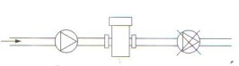 用聚四氟乙烯(PTFE)管材做的電磁流量計的傳感器襯里,它與傳感器測量管管壁一般不粘貼,因此,對真空負壓是敏感的。管道內真空會抽癟聚四氟乙烯襯里,使襯里呈波浪型拱起——典型的負壓破壞形態,這樣破壞了電極的密封,傳感器就不能工作了。因此,PTFE襯里的傳感器不能用于負壓系統,也應盡可能避免安裝在可能產生瞬間負壓的地方。如傳感器不應裝在泵的吸入端;閘閥應裝在傳感器的后側,如圖所示。