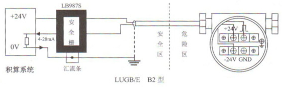一、輸出頻率信號的三線制渦街流量儀表配線設計 渦街流量計輸出頻率信號的三線制流量傳感器采用DC24V或DC12V電源供電,一般通過三芯屏蔽電纜線(RWP3×0.5mm)與顯示儀表或計算機相連,屏蔽層應可靠地接到放大器殼的接地螺絲上。屏蔽電纜線的選擇應適合現場環境要求,另外屏蔽電纜線要與其它強功率電力線分離,不能平行走線。 二、輸出標準4~20mA電流信號的兩線制渦街流量儀表配線設計 輸出標準4~20mA電流信號的兩線制變送器采用DC24V電源供電,一般通過兩芯屏蔽電纜線(RWP3×0.5mm)與顯示儀表或計算機相連,屏蔽層應可靠地接到放大器殼的接地螺絲上。屏蔽電纜線的選擇應適合現場環境要求,外屏蔽電纜線要與其它強功率電力線分離,不能平行走線。 三、帶RS-485通訊接口功能的渦街流量儀表配線設計 帶RS-485通訊功能的渦街流量儀表采用DC24V電源供電,與其它設備之間采用四線制傳輸方式。 四、防暴型渦街流量儀表配線設計 LUGB/E三線制脈沖輸出型渦街流量儀表與LB978齊納安全柵相連、LUGB/E兩線制標準4~20mA電流輸出型渦街流量儀表與LB987S齊納安全柵相連可構成本質安全型防爆系統,產品防爆標志為Ex iaⅡCT2-T5。本安防爆型渦街流量傳感器/變送器與防爆安全柵和積算系統等關聯設備的接線性請參看防爆安全柵廠家提供的接線說明和以下所示圖。 注意事項: (1)防爆型傳感器和變送器安裝于危險場所,安全柵、顯示儀表、供電電源,計算機等關聯設備必須安裝在安全場所。 (2)傳感器和變送器應有可靠接地,防爆地線不得與強電系統保護接地共用。