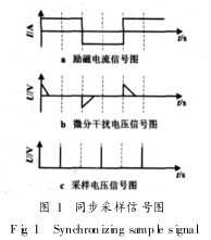 在現(xiàn)行的電磁流量計設計中,低頻矩形波勵磁方式結合了直流勵磁和交流勵磁兩者的優(yōu)點, 成為主要勵磁方式之一。在低頻勵磁方式下, 其干擾主要表現(xiàn)為: 由勵磁電流突變產(chǎn)生的微分干擾信號[ 1] 。理想勵磁磁場信號為低頻矩形波, 實際上隨著勵磁電流變化 ( dI /dt)在磁場上產(chǎn)生微分干擾信號, 隨著電流的穩(wěn)定, 干擾信號隨之消失, 因此同步采樣技術可以有效抑制微分干擾信號。實際設計中, 模數(shù)轉化器使用 AD 公司的 24位 Sigma Delta模數(shù)轉化器 AD7714。 AD7714 可以分別采用硬件和軟件方式進行采樣開始時間控制, 從而實現(xiàn)同步采樣。采用軟件方式時, 當控制寄存器中FSYNC位為邏輯 1時, 模數(shù)轉換器處于復位狀態(tài); 向該位寫邏輯 0時, 器件開始采樣輸入信號。在應用中,低頻勵磁信號由 M SP430單片機內部定時器產(chǎn)生, 同時產(chǎn)生采樣信號。如圖 1所示, 采樣開始時間滯后勵磁信號14 個周期。