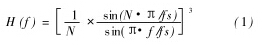 當流體流速較小時, 工頻干擾信號與有效流量信號在同一數(shù)量級, 嚴重影響測量結果。已知工頻耦合噪聲基波頻率為 50 Hz , 因此可以采用模擬或數(shù)字濾波器使濾波器帶寬限制在 50 Hz以內以抑制噪聲。在實際應用中使用 Sigma Delta模數(shù)轉換器 AD7714內部包含的數(shù)字濾波模塊, 數(shù)字濾波器相對模擬濾波器除具有靈活性高、參數(shù)設置方便等特點之外,還可以降低 A /D 轉換期間引入的噪聲。AD7714數(shù)字濾波器為 ( sinx /x )3低通濾波器, 其在頻域的傳遞函數(shù)為: