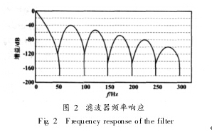 式中: fs為采樣頻率; AD7714采樣頻率為 1912 kHz ; N為濾波采樣個數(shù); f 為數(shù)字濾波器響應頻率。通過設定濾波采樣個數(shù)可以改變數(shù)字濾波器的截止頻率和一次陷波頻率。在本設計中綜合考慮模數(shù)轉換速度和去除噪聲性能, 設置 N 值使濾波器截止頻率為 50 Hz, 濾波器頻域響應如圖 2所示, 濾波器對工頻 50 Hz及其偶次諧波有很好的抑制作用。