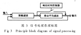 泥漿干擾是在測量泥漿、纖維漿等固液兩相特性液體時, 固體顆粒或者氣泡與電極發(fā)生摩擦, 在電極表面的電化學電動勢突然變化, 電磁流量計傳感器輸出信號輸出尖峰脈沖狀干擾。在低頻勵磁情況下, 泥漿干擾產(chǎn)生的尖脈沖數(shù)量級大, 極大地影響流量的準確測量,在實際設計中,采用多種信號處理混合方式抑制噪聲,信號處理原理如圖 3所示。