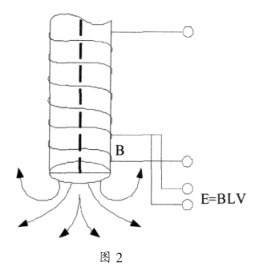 與一般污水流量計不同的是, 插入式污水流量計的傳感器是外側形成外發射磁場, 測量電極在傳感器的端部或兩側如圖 2 所示,值得注意的是,外發射磁場電磁流速傳感器的感應信號受流體和磁場的邊界層厚度影響, 會降低測量的線性度。