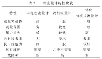 根據三種流量計的特點,從測量精確度、測量范圍、壓力損失、抗干擾能力及運行維護等方面進行比較,如表2所示。