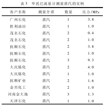 由于被測介質管徑較大(DN700),工作流量范圍寬(10~150t/h),渦街流量計和一體化節流式流量計在低流量時保證測量的準確性方面差一些,會造成一定的測量誤差,而畢托巴流量計測量范圍較寬,既能夠保證小流量時準確測量,又能滿足大流量的準確測量,同時在大管徑上的安裝也較易實現。參照其他企業畢托巴流量計測量低壓蒸汽的成功經驗,如表3所示,確定該低壓蒸汽計量采用的流量計為畢托巴蒸汽流量計。