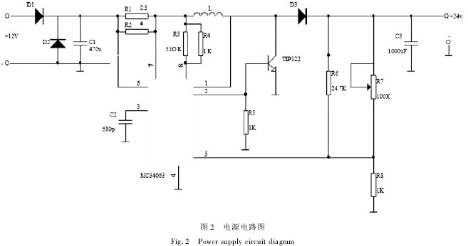 電源電路圖如圖2所示。圖2中,為了保證液位傳感器能獲得24V的直流供電,選用具有DC-DC單片控制電路功能的MC34063芯片,片內(nèi)包含有溫度補(bǔ)償帶隙基準(zhǔn)源,能輸出1.5A的開關(guān)電源,且是使用最少的外接元件構(gòu)成的升壓變換器、降壓變換器和電源反向器[5]。