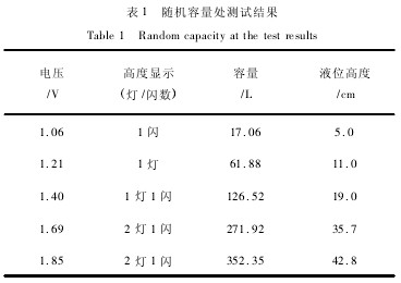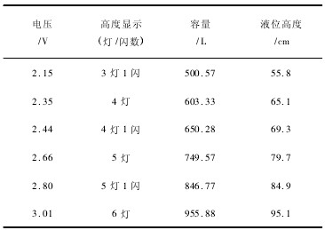 首先將液位計(jì)正確安裝于儲(chǔ)液罐底部,接通電源后利用串有流量計(jì)的電泵開始注水,注意觀察液位的變化,待快到預(yù)先暫定的水容量處關(guān)閉電源。此時(shí),用萬用表讀取液位計(jì)處理后的電壓值、記錄表示高度顯示的LED的燈/閃數(shù)及流量計(jì)顯示的實(shí)際注水容量,再用米尺丈量水的實(shí)際液位高度。試驗(yàn)結(jié)果如表1所示。