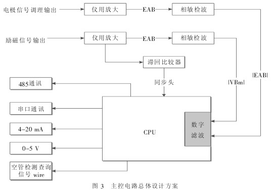 0引言 挖泥船電磁流量計用來指導挖泥船操作施工,防止堵管、悶耙,與密度測量設備一起使用構成產量計,為施工操作與管理提供決策數據,有利于提高施工效率。其測量介質為液固兩相流體,有別于通常意義下的單一介質,測量難度大大增加。而電磁流量計(EMF)是根據電磁感應定律制成的一種測量導電性流體流量的儀表[1]。與現有各種流量儀表相比,其直線性好、測量精度高、測量范圍和適用范圍廣、耐腐蝕性能強,可以解決其他流量計不易解決的問題,如臟污流、腐蝕流等的測量[2]。 目前國內應用于挖泥船的電磁流量計大多存在零點漂移、轉換精度不高、流速不穩、空管檢測易失常等諸多問題。對此,我們進行了相關研究并提出相應改進措施,現已研發出一種專門用于挖泥船的電磁流量計,在耙吸式挖泥船上成功應用,取得了很好的效果。本文通過信號處理和空管檢測功能詳細介紹該新型挖泥船電磁流量計。 1電磁流量計工作原理 電磁流量計分為傳感器和轉換器兩部分。傳感器是把流過管道內的導電流體的流速信號轉換為電信號,轉換器是把傳感器輸出的電信號進行有用信號識別提取并進行相關處理,用于主機顯示,主要由勵磁電路、信號調理電路、微處理電路等部分組成。圖1為傳感器工作原理示意圖。 根據法拉第電磁感應定律,當一導體在磁場中運動而切割磁力線時,在導體兩端便會產生感應電動勢。設在均勻磁場中,垂直于磁場方向有一個直徑為D的管道。管道由不導磁材料制成,內表面加絕緣襯里。當導電的液體在管道中流動時,導電液體就切割磁力線,因而在磁場及流動方向垂直的方向將產生感應電動勢。如果在管道截面垂直于磁場的直徑兩端安裝一對電極,只要管道內流速υ為軸對稱分布,兩極之間就會產生感應電動勢[3],此感應電動勢與流速具有線性關系。其表達式為: E=K·B·D·V(1) 式中:V為測量管道內截面上的平均流速(m/s); K為儀表常數; D為測量管內直徑(m); B為磁感應強度(T)。 轉換器將此感應電動勢測出,再根據線性關系式即可得出流速信號。圖2為電磁流量計整體設計示意圖。 考慮到傳感器出來的微弱信號容易在傳輸線上損耗,故而電極信號調理板和空管檢測功能板就近放置于傳感器出線口,調理后經屏蔽線傳輸至轉換器上的主控電路。 結構上管道本身就是個大的屏蔽體,防止勵磁線圈磁場泄露,信號采用屏蔽線傳輸,減少線與線之間信號干擾,以及空間傳播的干擾,保證信號的完整性。 電路上采用雙核主從式控制,方便流速測量及其空管檢測,克服了以往電磁流量計需要配合密度計來使用的缺陷;同時利用微機技術,使其各方面性能大大提高,更加智能化,更加便于管理施工。 2勵磁方式的合理選擇 目前國產挖泥船流量計大多采用低頻方波勵磁方式,其主要特點是能避免零點漂移及無正交干擾,抗同相干擾能力較好[4]。但對于液固兩相流體而言,當固體顆粒撞擊電極,表面電位變化形成尖峰狀噪聲,信號呈現大幅度波動。而低頻方波勵磁不能從硬件技術上消除這種由于沖擊造成的干擾,要實現測量結果的穩定,只能通過調整勵磁頻率外加軟件手段加以消除,但有兩方面的缺陷: (1)挖泥船上工況復雜,挖泥工況與合適勵磁頻率匹配問題很難完美解決,只能通過現場不斷調試較合適的頻率參數。同一工地不同土質都需要改變頻率參數,以目前的現場條件及技術水平,要做到這一步非常困難,目前基本上采用大體上可測量的單一頻率。 (2)采用軟件濾波降低由沖擊噪聲產生的波動幅度,波動幅度平滑程度越高,則測量結果的真實性和實時性就越差,很多情況下會導致測量結果失真,尤其當高流速、固體含量高、大顆粒的工況。 而采用工頻(50Hz)電源交流勵磁方式,消除了電極表面的極化于擾,抗固體顆粒撞擊電極形成尖峰狀噪聲能力強。由于磁場是交變的,所以輸出信號也是交變信號,放大和轉換低電平的交流信號要比直流信號容易得多。但值得注意的是,用交流勵場會帶來一系列的電磁干擾問題。例如正交干擾、同相干擾等,這些干擾信號與有用的流量信號混雜在一起。因此,如何正確區分流量信號與干擾信號,并如何有效地抑制和排除各種干擾信號,就成為交流勵磁電磁流量計成功應用于液固兩相流體測量的關鍵點。 3信號處理的改進 液固兩相流介質(尤其含大塊顆粒的情況)與測量管道的摩擦及對測量元件不定時的沖擊,會產生大量強度的干擾信號,常規信號處理技術會造成測量結果大幅度波動、回零等現象,情況嚴重時會失去測量意義。對于信號處理有兩個難點:第一,如何將微弱的流量信號與干擾信號區分開來;第二,如何保證測量的實時性和正確率。解決干擾的辦法: (1)首先需要設計合理的回路結構,利用信號調理電路減少大部分干擾信號。 (2)主控制電路上通過相敏檢波等一系列硬件電路再結合軟件進行相位補償和零位補償進一步消除正交干擾信號和同相干擾。 為了保證測量的實時性和準確性,先將勵磁信號和感生電勢信號進行數字濾波,再利用軟件算法進行除法運算得到流速信號,借此來得到穩定的實時流速。 主控制電路總體設計方案如圖3所示。 電極檢測出的微弱感應電動勢E,先經前置放大器的放大和噪聲抑制而成為大幅度低阻抗的電壓信號。此信號經相敏檢波后,給CPU進行數字濾波、處理和控制,通過利用雙線性變換法將模擬的二階巴