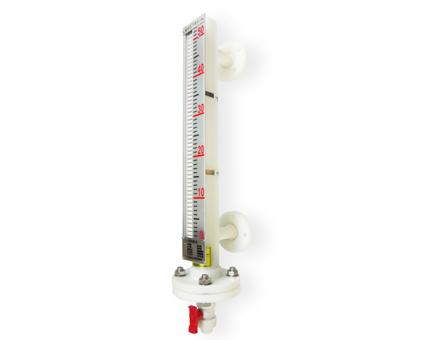 磁翻板液位計主體外的翻板箱受主體內浮子(具有定向磁性源,按不同介質和壓力針對訂貨)的作用促其翻板翻動并顯示紅白顏色,并隨浮子的移動指示不同的液面高度,紅色始終表示液位的高低。在指示器左側配有醒目的刻度標尺,從而使液位的指示顯得更加清晰。