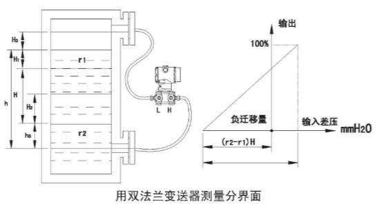 由于兩個法蘭安裝時有高度差,故調(diào)整時應加遷移。負壓遠傳法蘭在上方加負遷移,計算方法如下: