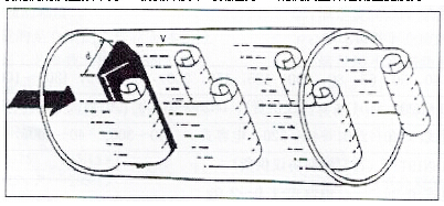 在氣體流體中設(shè)置三角柱型旋渦發(fā)生體,則從旋渦發(fā)生體兩側(cè)交替地產(chǎn)生有規(guī)則的旋渦,這種旋渦稱為卡門旋渦,如右圖所示,旋渦列在旋渦發(fā)生體下游非對(duì)稱地排列。