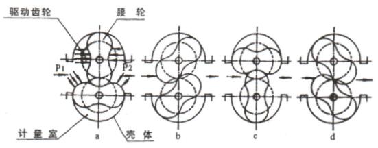 當被測液體流經計量室時,在流量計的進出口形成壓差,腰輪在此壓差的推動下旋轉.同時通過固定在腰輪軸上的一對驅動齒輪,使兩個腰輪保持連續(xù)旋轉。隨著腰輪的轉動。液體經由計量室被不斷排出流量計。每對流過的液體量是計量室容積的四倍,通過密封聯(lián)軸器、減速機構。將旋轉次數(shù)減速后傳遞到計數(shù)器,計數(shù)器即指示液體瞬時流量和累積流量.
