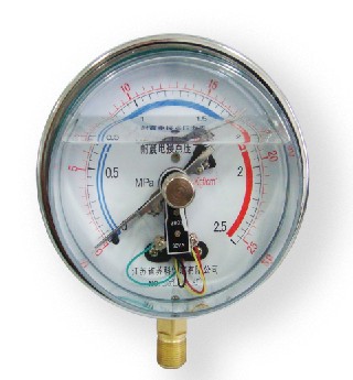 在電接點壓力表裝置的電接觸信號針上,裝有可調節的永久磁鋼,可以增加接點吸力,加快接觸動作,從而使觸點接觸可靠,消除電弧,能有效的避免儀表由于工作環境振動或介質壓力脈動造成觸點的頻繁關斷。所以電接點壓力表具有動作可靠、使用壽命長、觸點開關功率較大等優點。